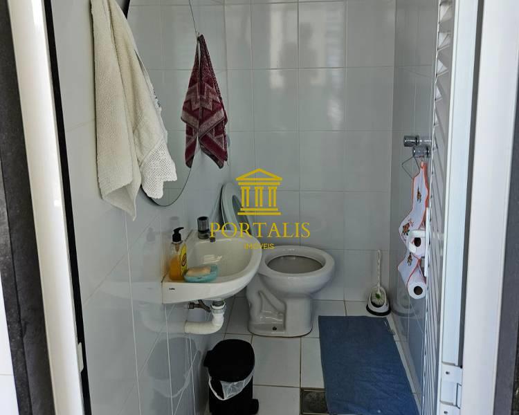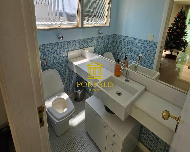 Banheiro social com bancada em granito, armários, espelho e box em blindex